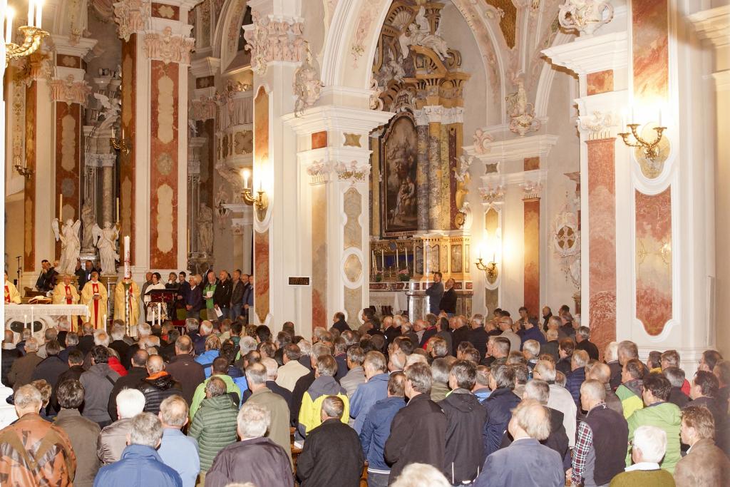 Am Samstag, 13.Mai, abends machte sich wiederum ein langer Lichterzug von Brixen Richtung Neustift auf den Weg.  Über die Auenhausbrücke, den Weinbergweg hinauf, dann dem Hartmannsweg entlang, waren um die 700 Männer betend und schweigend unterwegs zur Stiftskirche in Neustift.  Leichter Regen setzte ein, als die Wallfahrer bereits vor Neustift, dann bei der Engelsburg und in der Kirche mit Bläsermusik empfangen wurden.