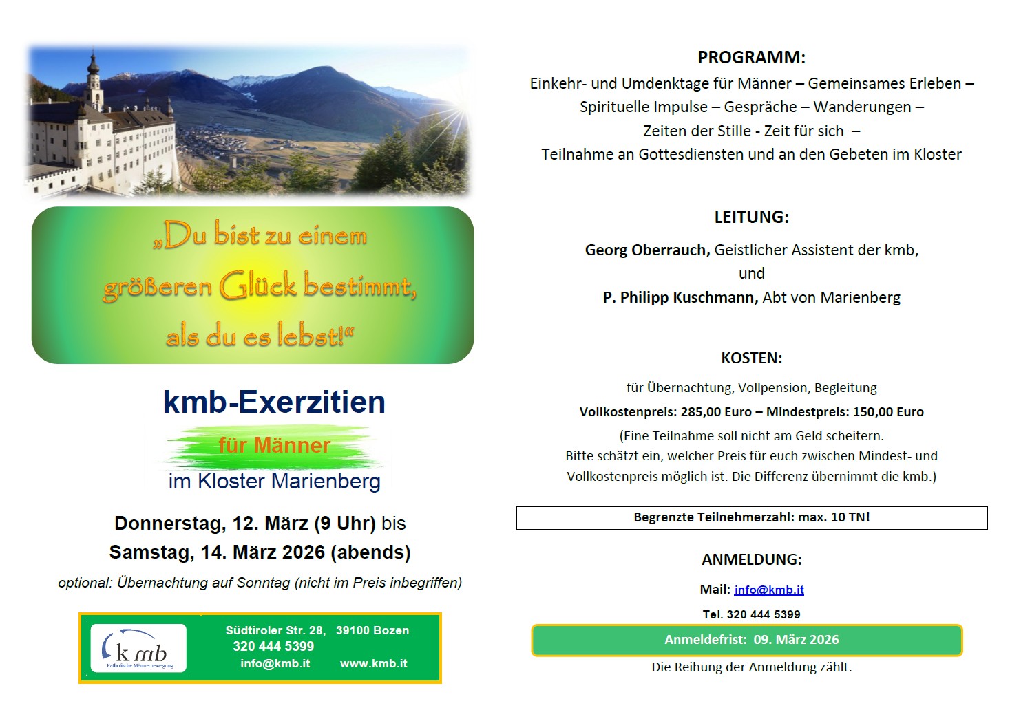 Die kmb-Exerzitien starten am Donnerstag, 12.03. um 9 Uhr und enden am Samstag,14.03. abends. Optional kann noch eine Übernachtung auf Sonntag dazugebucht werden. Spirituelle Impulse, Einzelgespräche, Wanderungen und die Mitfeier beim Stundengebet öffnen vielfältige Kraftquellen. Nähere Infos und Anmeldung unter: info@kmb.it oder 3204445399.